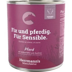 Zutaten: 50,00 % Pferd (Muskelfleisch), 18,00 % Zucchini*, 17,75 % Kochsud*, 10,00 % Süßkartoffel*, 1,00 %Bierhefe, 1,00 % Flohsamen*, 1,00 % Sonnenblumenöl*, 0,50 % Leinöl*, 0,35 % Eierschalenpulver*, 0,30 % Lebertran, 0,10 % Knotentang* (Ascophyllum nodosum)* aus kontrolliert biologischer Erzeugung, davon Gesamtanteil 48,7 %